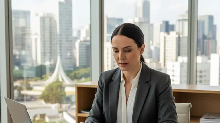 Empresária brasileira revisando documentos de planejamento tributário em escritório moderno em São Paulo, expressão concentrada