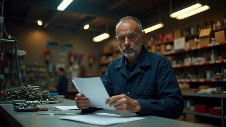 Employé de quincaillerie en bleu de travail consultant un contrat de travail au comptoir d'un magasin de fournitures industrielles à Lyon