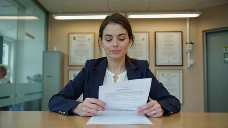 Secrétaire médicale française consultant un contrat de travail à la réception d'un cabinet médical parisien