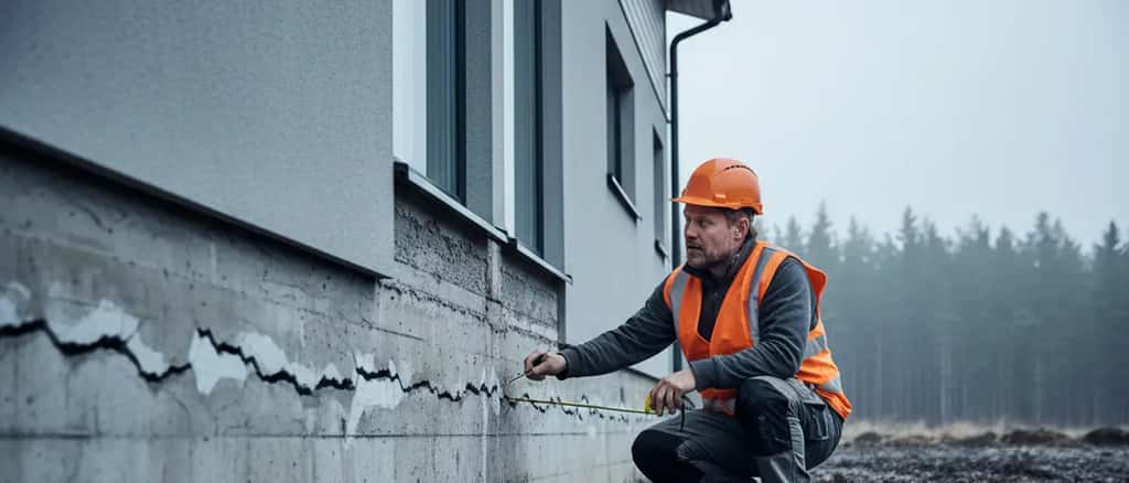 Dokumentera allt. Fotografera sprickor, sättningar och skador på fasad, grund och källare. Datum och klockslag är viktiga för eventuella försäkrings- och skadeståndsärenden.